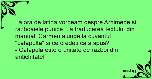La ora de latina vorbeam despre Arhimede si razboaiele punice. La traducerea textului din manual, Carmen ajunge la cuvantul "catapulta" si ce credeti ca a spus?