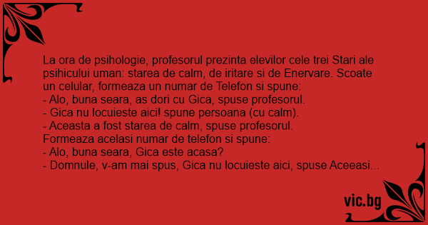 La ora de psihologie, profesorul prezinta elevilor cele trei Stari ale psihicului uman: starea de calm, de iritare si de Enervare. Scoate un celular, formeaza un numar de Telefon si spune: