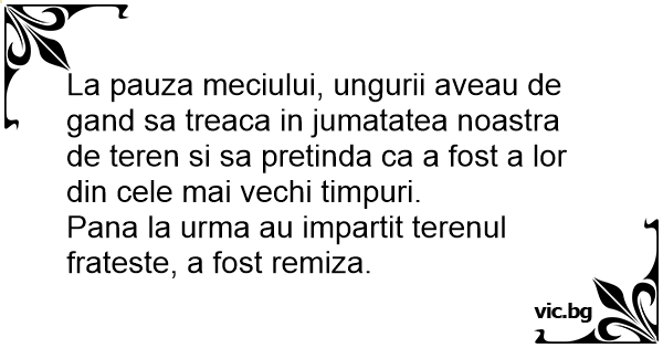 La pauza meciului, ungurii aveau de gand sa treaca in jumatatea noastra de teren si sa pretinda ca a fost a lor din cele mai vechi timpuri. Pana la urma au impartit terenul frateste, a fost remiza.