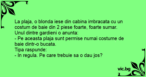 La plaja, o blonda iese din cabina imbracata cu un costum de baie din 2 piese foarte, foarte sumar. Unul dintre gardieni o anunta: - Pe aceasta plaja sunt permise numai costume de baie dintr-o bucata. Tipa raspunde: - In regula. Pe care trebuie sa o dau jos?