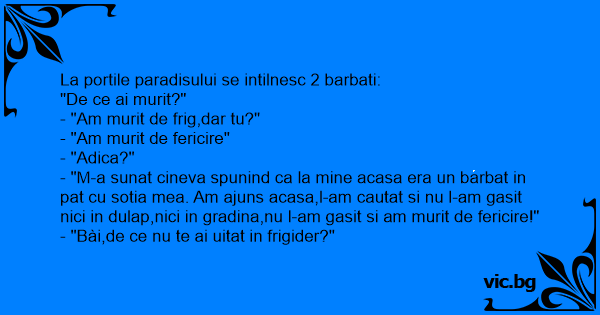 - "M-a sunat cineva spunind ca la mine acasa era un barbat in pat cu sotia mea. Am ajuns acasa,l-am cautat si nu l-am gasit nici in dulap,nici in gradina,nu l-am gasit si am murit de fericire!"