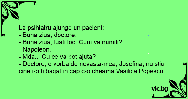 - Doctore, e vorba de nevasta-mea, Josefina, nu stiu cine i-o fi bagat in cap c-o cheama Vasilica Popescu.