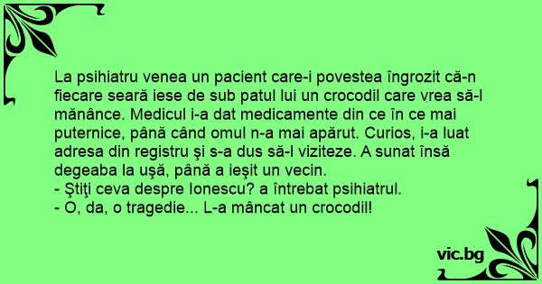 La psihiatru venea un pacient care-i povestea îngrozit că-n fiecare seară iese de sub patul lui un crocodil care vrea să-l mănânce. Medicul i-a dat medicamente din ce în ce mai puternice, până când omul n-a mai apărut. Curios, i-a luat adresa din registru şi s-a dus să-l viziteze. A sunat însă degeaba la uşă, până a ieşit un vecin.