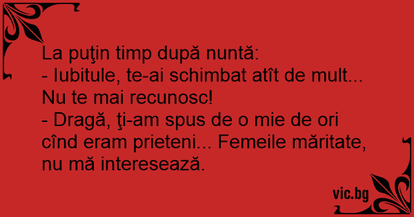 La puţin timp după nuntă:<br />- Iubitule, te-ai schimbat atît de mult... Nu te mai recunosc!<br />- Dragă, ţi-am spus de o mie de ori cînd eram prieteni... Femeile măritate, nu mă interesează.