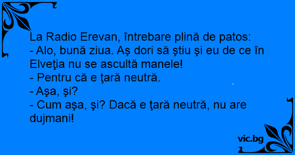- Alo, bună ziua. Aş dori să ştiu şi eu de ce în Elveţia nu se ascultă manele!