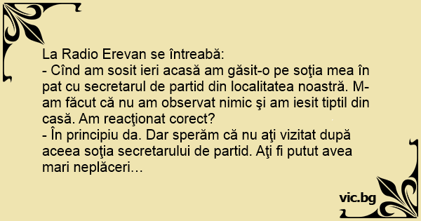 - Cînd am sosit ieri acasă am găsit-o pe soţia mea în pat cu secretarul de partid din localitatea noastră. M-am făcut că nu am observat nimic şi am iesit tiptil din casă. Am reacţionat corect?