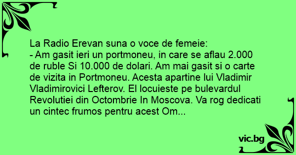 - Am gasit ieri un portmoneu, in care se aflau 2.000 de ruble Si 10.000 de dolari. Am mai gasit si o carte de vizita in Portmoneu. Acesta apartine lui Vladimir Vladimirovici Lefterov. El locuieste pe bulevardul Revolutiei din Octombrie In Moscova. Va rog dedicati un cintec frumos pentru acest Om...