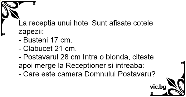 - Postavarul 28 cm Intra o blonda, citeste apoi merge la Receptioner si intreaba: