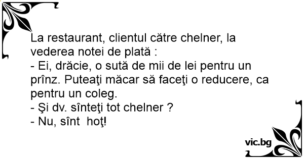- Ei, drăcie, o sută de mii de lei pentru un prînz. Puteaţi măcar să faceţi o reducere, ca pentru un coleg.