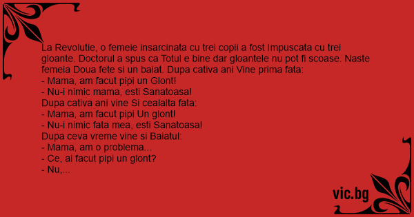 La Revolutie, o femeie insarcinata cu trei copii a fost Impuscata cu trei gloante. Doctorul a spus ca Totul e bine dar gloantele nu рот fi scoase. Naste femeia Doua fete si un baiat. Dupa cativa ani Vine prima fata: