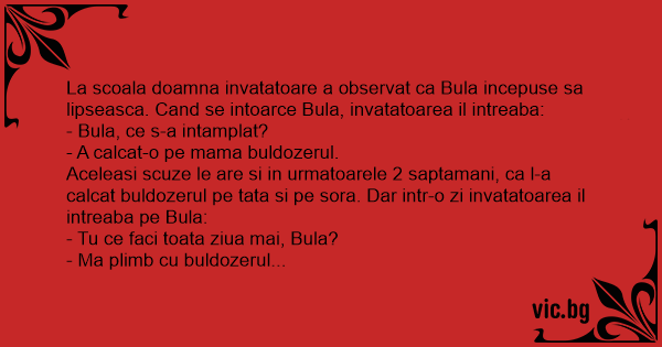 Aceleasi scuze le are si in urmatoarele 2 saptamani, ca l-a calcat buldozerul pe tata si pe sora. Dar intr-o zi invatatoarea il intreaba pe Bula: