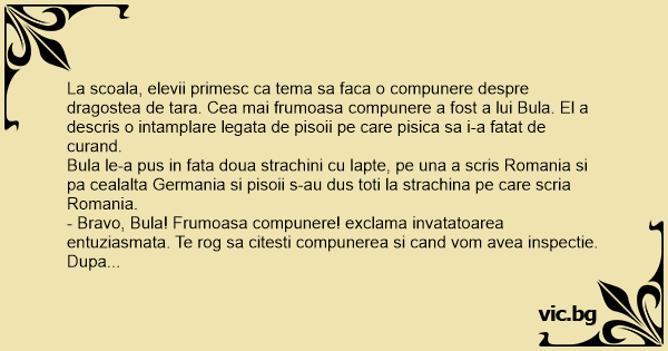 - Bravo, Bula! Frumoasa compunere! exclama invatatoarea entuziasmata. Te rog sa citesti compunerea si cand vom avea inspectie.