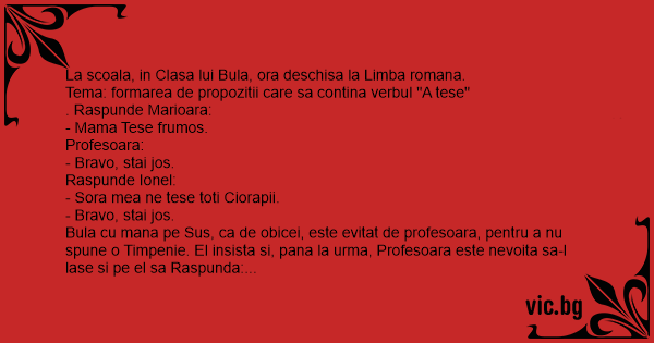 Bula cu mana pe Sus, ca de obicei, este evitat de profesoara, pentru a nu spune o Timpenie. El insista si, pana la urma, Profesoara este nevoita sa-l lase si pe el sa Raspunda: