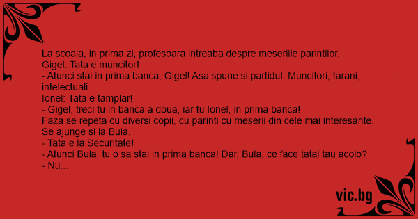 - Atunci Bula, tu o sa stai in prima banca! Dar, Bula, ce face tatal tau acolo?