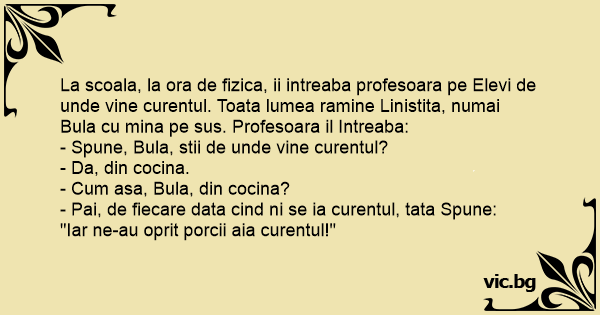 La scoala, la ora de fizica, ii intreaba profesoara pe Elevi de unde vine curentul. Toata lumea ramine Linistita, numai Bula cu mina pe sus. Profesoara il Intreaba: