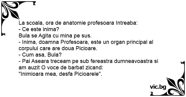 - Inima, doamna Profesoara, este un оrgаn principal al corpului care are doua Picioare.