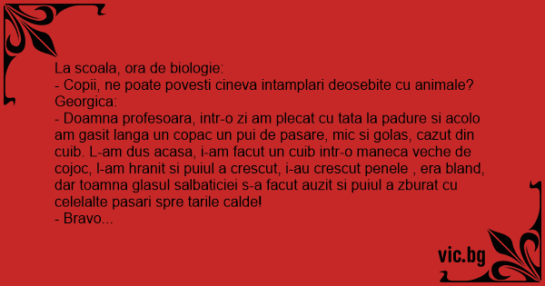 - Doamna profesoara, bunicul meu e baci la o stana si intr-o noapte, cu vreme mai inchisa, cu ceata, o ursoaica mare a venit si a sarit in tarla la oi! Bunicul a sarit la ea, sa o alunge si atunci ursoaica s-a ridicat in doua labe si l-a prins pe bunicul cu brancile! Bunicu' (nu-l cunosteti pe bunicu', dar e un tip ca bradul, trait numa' la stana!) a prins-o si el in brate, s-a incordat si a trantit-o la pamant! Si daca tot era la pamant a si f*тuт-o !!!!