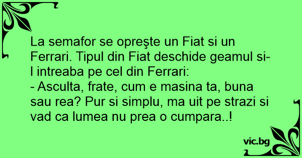 La semafor se opreşte un Fiat si un Ferrari. Tipul din Fiat deschide geamul si-l intreaba pe cel din Ferrari: