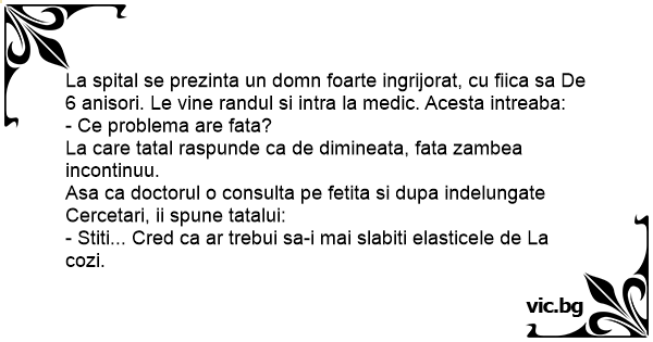 La spital se prezinta un domn foarte ingrijorat, cu fiica sa De 6 anisori. Le vine randul si intra la medic. Acesta intreaba: