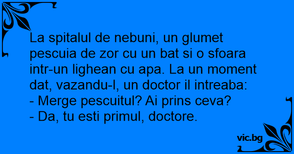La spitalul de nebuni, un glumet pescuia de zor cu un bat si o sfoara intr-un lighean cu apa. La un moment dat, vazandu-l, un doctor il intreaba: