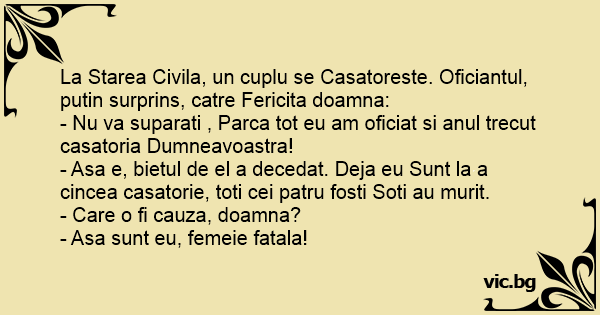 - Asa e, bietul de el a decedat. Deja eu Sunt la a cincea casatorie, toti cei patru fosti Soti au murit.