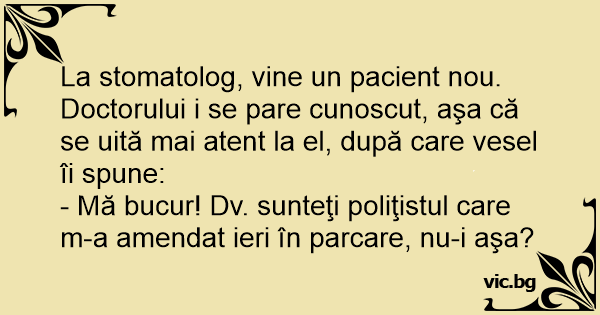 La stomatolog, vine un pacient nou. Doctorului i se pare cunoscut, aşa că se uită mai atent la el, după care vesel îi spune: