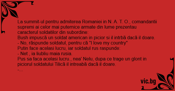 La summit-ul pentru admiterea Romaniei in N. A. T. O., comandantii supremi ai celor mai puternice armate din lume prezentau caracterul soldatilor din subordine: