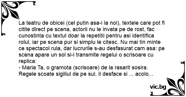 La teatru de obicei (cel putin asa-i la noi), textele care рот fi citite direct pe scena, actorii nu le invata pe de rost, fac cunostinta cu textul doar la repetitii pentru asi identifica rolul, iar pe scena pur si simplu le citesc. Nu mai tin minte ce spectacol rula, dar lucrurile s-au desfasurat cam asa: pe scena apare un sol si-i transmite regelui o scrisoare cu replica: