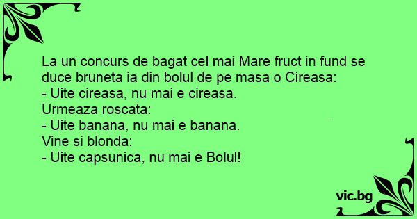 La un concurs de bagat cel mai Mare fruct in fund se duce bruneta ia din bolul de pe masa o Cireasa: