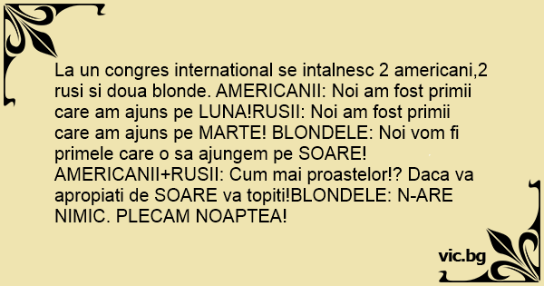 La un congres international se intalnesc 2 americani,2 rusi si doua blonde. AMERICANII: Noi am fost primii care am ajuns pe LUNA!RUSII: Noi am fost primii care am ajuns pe MARTE! BLONDELE: Noi vom fi primele care o sa ajungem pe SOARE! AMERICANII+RUSII: Сuм mai proastelor!? Daca va apropiati de SOARE va topiti!BLONDELE: N-ARE NIMIC. PLECAM NOAPTEA!