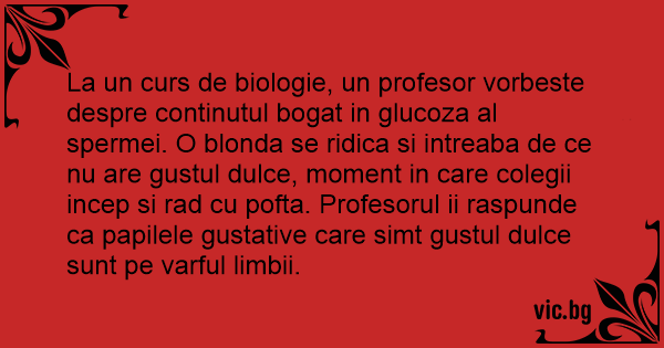 La un curs de biologie, un profesor vorbeste despre continutul bogat in glucoza al spermei. O blonda se ridica si intreaba de ce nu are gustul dulce, moment in care colegii incep si rad cu pofta. Profesorul ii raspunde ca papilele gustative care simt gustul dulce sunt pe varful limbii.