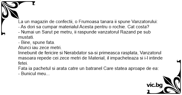 Innebunit de fericire si Nerabdator sa-si primeasca rasplata, Vanzatorul masoara repede cei zece metri de Material, il impacheteaza si i-l intinde fetei.