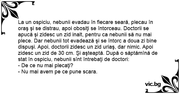 La un ospiciu, nebunii evadau în fiecare seară, plecau în oraş şi se distrau, apoi obosiţi se întorceau. Doctorii se apucă şi zidesc un zid inalt, pentru ca nebunii să nu mai plece. Dar nebunii tot evadează şi se întorc a doua zi bine dispuşi. Apoi, doctorii zidesc un zid uriaş, dar nimic. Apoi zidesc un zid de 30 cm. Şi aşteaptă. După o săptămînă de stat în ospiciu, nebunii sînt întrebaţi de doctori: