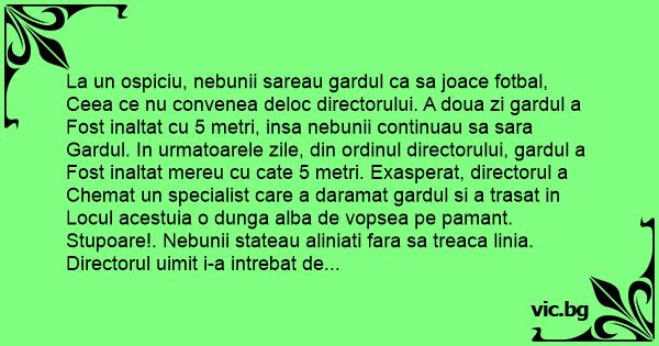 La un ospiciu, nebunii sareau gardul ca sa joace fotbal, Ceea ce nu convenea deloc directorului. A doua zi gardul a Fost inaltat cu 5 metri, insa nebunii continuau sa sara Gardul. In urmatoarele zile, din ordinul directorului, gardul a Fost inaltat mereu cu cate 5 metri. Exasperat, directorul a Chemat un specialist care a daramat gardul si a trasat in Locul acestuia o dunga alba de vopsea pe pamant.