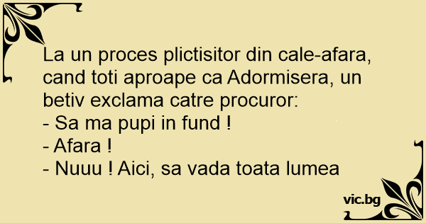 La un proces plictisitor din cale-afara, cand toti aproape ca Adormisera, un betiv exclama catre procuror: