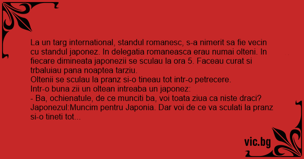 La un targ international, standul romanesc, s-a nimerit sa fie vecin cu standul japonez. In delegatia romaneasca erau numai olteni. In fiecare dimineata japonezii se sculau la ora 5. Faceau curat si trbaluiau pana noaptea tarziu.