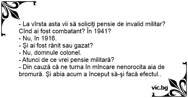 - La vîrsta asta vii să soliciţi pensie de invalid militar? Cînd ai fost combatant? În 1941?