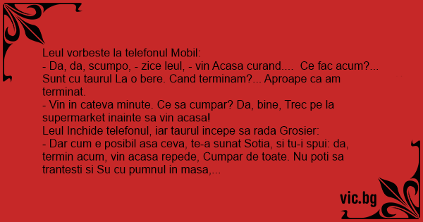 - Da, da, scumpo, - zice leul, - vin Acasa curand.... Ce fac acum?... Sunt cu taurul La o bere. Cand terminam?... Aproape ca am terminat.