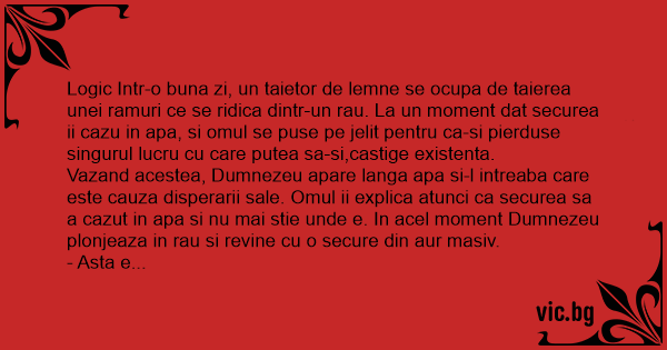 Logic Intr-o buna zi, un taietor de lemne se ocupa de taierea unei ramuri ce se ridica dintr-un rau. La un moment dat securea ii cazu in apa, si omul se puse pe jelit pentru ca-si pierduse singurul lucru cu care putea sa-si,castige existenta.