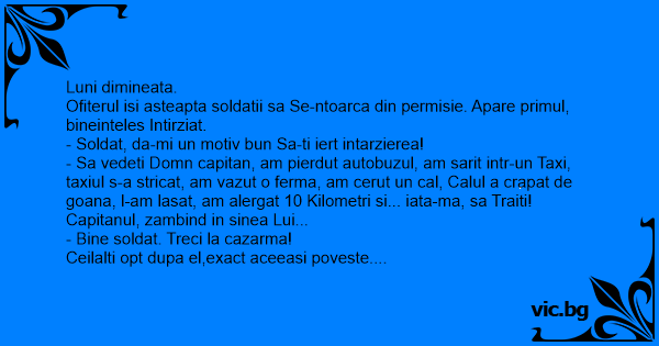 - Sa vedeti Domn capitan, am pierdut autobuzul, am sarit intr-un Taxi, taxiul s-a stricat, am vazut o ferma, am cerut un cal, Calul a crapat de goana, l-am lasat, am alergat 10 Kilometri si... iata-ma, sa Traiti!