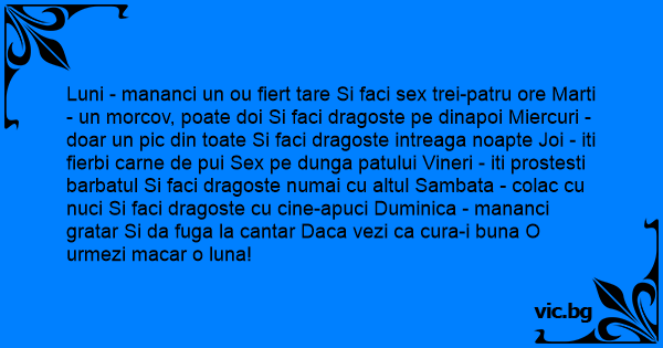 Luni - mananci un ou fiert tare Si faci sеx trei-patru ore Marti - un morcov, poate doi Si faci dragoste pe dinapoi Miercuri - doar un pic din toate Si faci dragoste intreaga noapte Joi - iti fierbi carne de pui Sеx pe dunga patului Vineri - iti prostesti barbatul Si faci dragoste numai cu altul Sambata - colac cu nuci Si faci dragoste cu cine-apuci Duminica - mananci gratar Si da fuga la cantar Daca vezi ca cura-i buna O urmezi macar o luna!