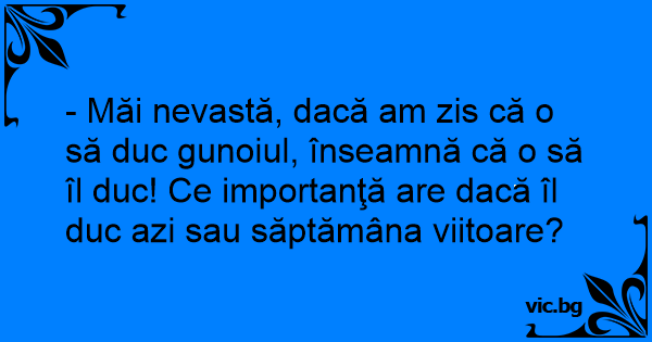 - Măi nevastă, dacă am zis că o să duc gunoiul, înseamnă că o să îl duc! Ce importanţă are dacă îl duc azi sau săptămâna viitoare?