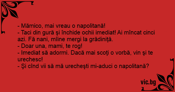 - Mămico, mai vreau o napolitană! - Taci din gură şi închide ochii imediat! Ai mîncat cinci azi. Fă nani, mîine mergi la grădiniţă. - Doar una, mami, te rog! - Imediat să adormi. Dacă mai scoţi o vorbă, vin şi te urechesc! - Şi cînd vii să mă urecheşti mi-aduci o napolitană?