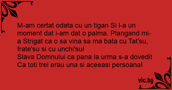 M-am certat odata cu un tigan Si l-a un moment dat i-am dat o palma. Plangand mi-a Strigat ca o sa vina sa ma bata cu Tat'su, frate'su si cu unchi'su!