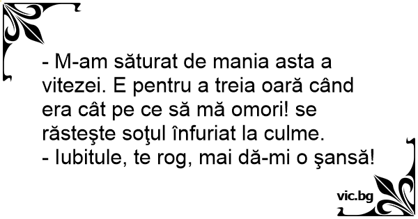 - M-am săturat de mania asta a vitezei. E pentru a treia oară când era cât pe ce să mă omori! se răsteşte soţul înfuriat la culme.
