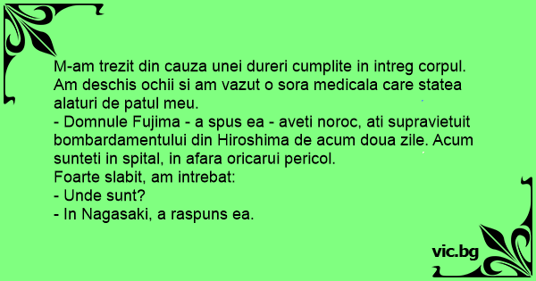 - Domnule Fujima - a spus ea - aveti noroc, ati supravietuit bombardamentului din Hiroshima de acum doua zile. Acum sunteti in spital, in afara oricarui pericol.
