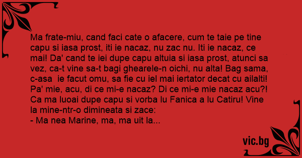 Ma frate-miu, cand faci cate o afacere, сuм te taie pe tine capu si iasa prost, iti ie nacaz, nu zac nu. Iti ie nacaz, ce mai! Da' cand te iei dupe capu altuia si iasa prost, atunci sa vez, ca-t vine sa-t bagi ghearele-n oichi, nu alta! Bag sama, c-asa ie facut omu, sa fie cu iel mai iertator decat cu ailalti! Pa' mie, acu, di ce mi-e nacaz? Di ce mi-e mie nacaz acu?! Ca ma luoai dupe capu si vorba lu Fanica a lu Catiru! Vine la mine-ntr-o dimineata si zace: