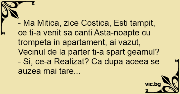 - Ma Mitica, zice Costica, Еsтi tampit, ce ti-a venit sa canti Asta-noapte cu trompeta in apartament, ai vazut, Vecinul de la parter ti-a spart geamul?
