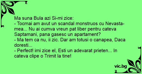 - Tocmai am avut un scandal monstruos cu Nevasta-mea... Nu ai cumva vreun pat liber pentru cateva Saptamani, pana gasesc un apartament?
