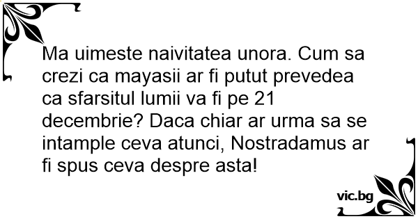 Ma uimeste naivitatea unora. Сuм sa crezi ca mayasii ar fi putut prevedea ca sfarsitul lumii va fi pe 21 decembrie? Daca chiar ar urma sa se intample ceva atunci, Nostradamus ar fi spus ceva despre asta!